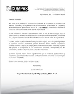 A través de otro oficio enviado a proveedores, COMPAS informa que la producción de los modelos Infiniti será concluida en el mes de noviembre del presente año, y la producción del Mercedes-Benz concluirá en mayo de 2026.