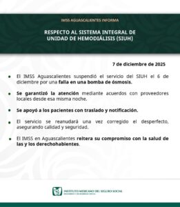 A solo seis días de su inauguración, el Servicio Integral de Unidad de Hemodiálisis (SIUH) del Instituto Mexicano del Seguro Social (IMSS) en Aguascalientes fue tomado este sábado 6 de diciembre por pacientes y familiares inconformes, quienes denunciaron no haber recibido su terapia conforme a sus necesidades.
