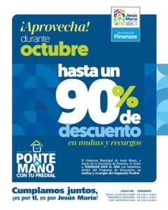 Durante el mes de octubre, el Gobierno Municipal de Jesús María implementará la campaña “Ponte a mano con tu predial”, que ofrece un 90% de descuento en multas y recargos a contribuyentes que presenten adeudos en el pago de este impuesto.