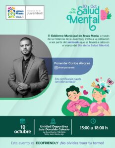 Con motivo del Día Mundial de la Salud Mental, que se conmemora el 10 de octubre, el Gobierno Municipal de Jesús María realizará diversas actividades orientadas a fortalecer la salud emocional y el bienestar psicológico de la población.