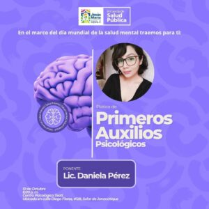 La Instancia de la Salud ofrecerá la charla gratuita “Primeros Auxilios Psicológicos”, impartida por Daniela Pérez, el jueves 10 de octubre a las 18:00 horas en el Centro Psicológico Teotl, ubicado en la calle Diego Flores, en el fraccionamiento Solar de Jonacatique.