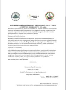 En un comunicado, llamaron a los agricultores a mantenerse unidos y atentos a la información sobre el diálogo, y pidieron comprensión a la ciudadanía por las afectaciones de las protestas, que buscan: