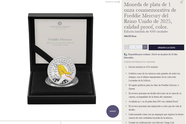 La edición se limita a 4,500 unidades. Cada moneda llega en un estuche que repasa la destacada trayectoria de Freddie Mercury y fue acuñada en una onza de plata fina 999 con acabado Proof.