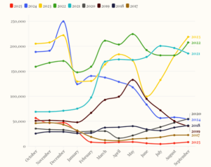 Más del 60 % de las aprehensiones en 2025 ocurrieron durante los últimos meses de la administración anterior, antes del regreso de Trump. En septiembre de 2025 las aprehensiones bajaron a cerca de 8,400, marca mensual récord.