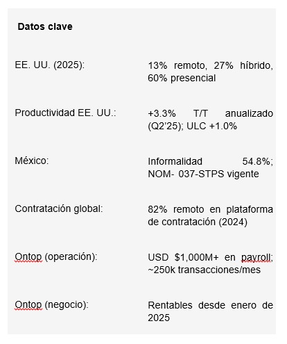 Ontop entra con un mensaje claro: convertir la administración de talento global en flujo único, auditable y con liquidez inmediata. Su productividad, reglas y rieles de pago siguen convergiendo, la pregunta para cada empresa será simple y dura: ¿puedes contratar hoy en 10 países, pagar al instante y dormir tranquilo en compliance? El mercado ya premia a quien responde “sí”.